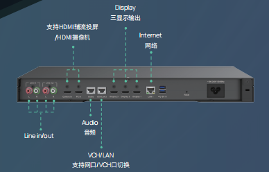 亿联MeetingEye 500 Pro系列采用分体式设计,支持上机柜及放桌上等安装部署方式,通过VCH接口集数据传输、信号控制和供电于一体,三线合一,配件*与主机之间只需一根网线即可连接,简化会议室线路布局,降低部署成本。*配件:包括摄像机、触控平板、扬声器、麦克风等。