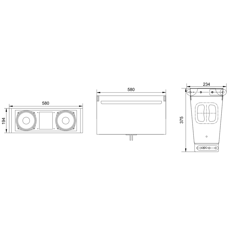 2x8”低频驱动器1x3”高频驱动器;一体成型线阵号角;’简单安全的吊挂件;快速的落地或吊挂安装;人体工程学把手的设置;采用防水防撞的金刚沙防水涂层;多层桦木夹板