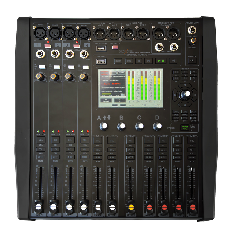 5.各通道均设有高精度行程推子、功能按键、静音按键、监听按键、信号灯、峰值灯;