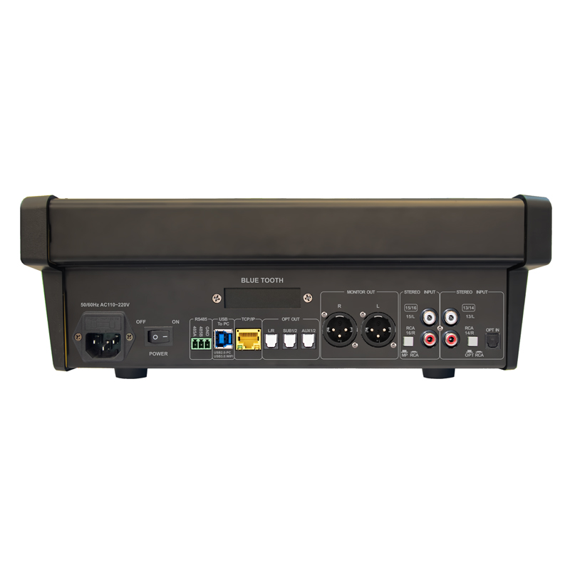 9.模拟输出具备:立体声L/R主输出,2路编组输出,2路辅助输出,音质处理设有延时、相位、音量、分频高通滤波、分频低通滤波、7段参数均衡、压缩器等功能;