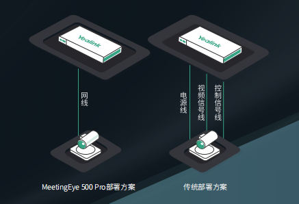 亿联MeetingEye 500 Pro系列采用分体式设计,支持上机柜及放桌上等安装部署方式,通过VCH接口集数据传输、信号控制和供电于一体,三线合一,配件*与主机之间只需一根网线即可连接,简化会议室线路布局,降低部署成本。*配件:包括摄像机、触控平板、扬声器、麦克风等。