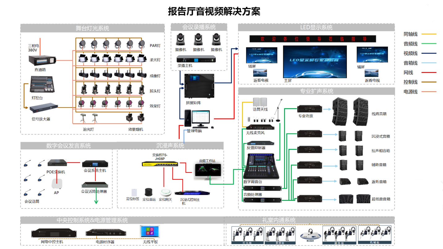 主要设备涵盖范围:线阵音箱+超低音音箱+专业功放+专业音箱+调音台+声卡+音频处理器