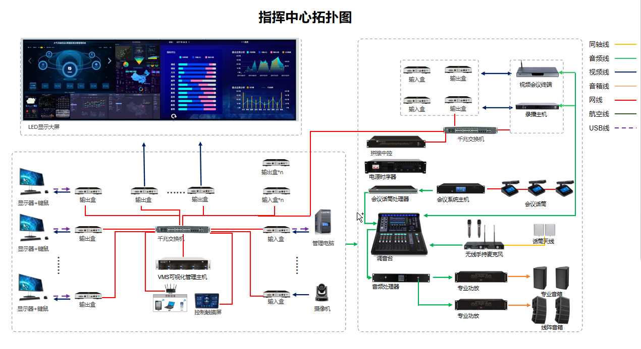 主要设备:拼接中控+控制器+触摸屏+台式机电脑+高清一体终端+台式机电脑+桌席指挥台+键鼠套装+显示器