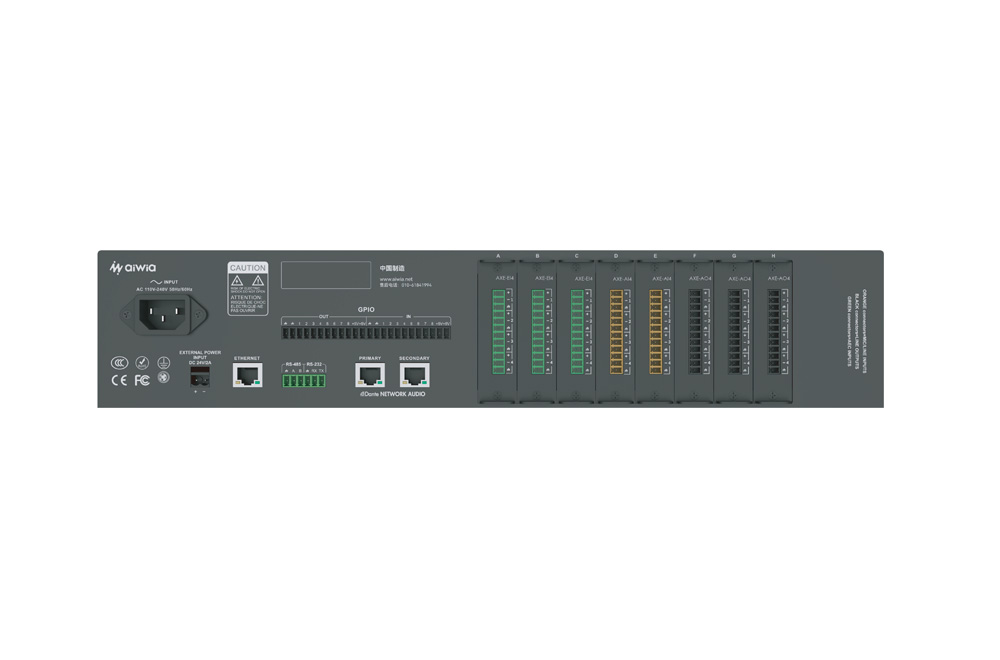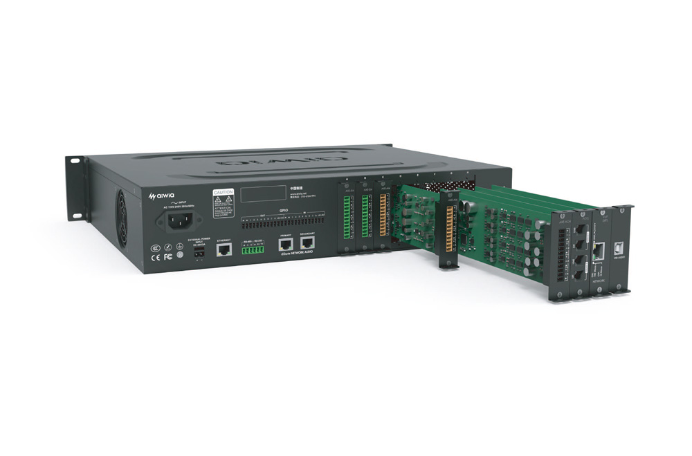 机箱式8卡槽插卡设计,单机最大支持32个自定义模拟通道,可选配4通道话筒/线路输入卡、4通道线路输出卡、4通道AEC(回声消除)话筒/线路输入卡、2x2USB声卡